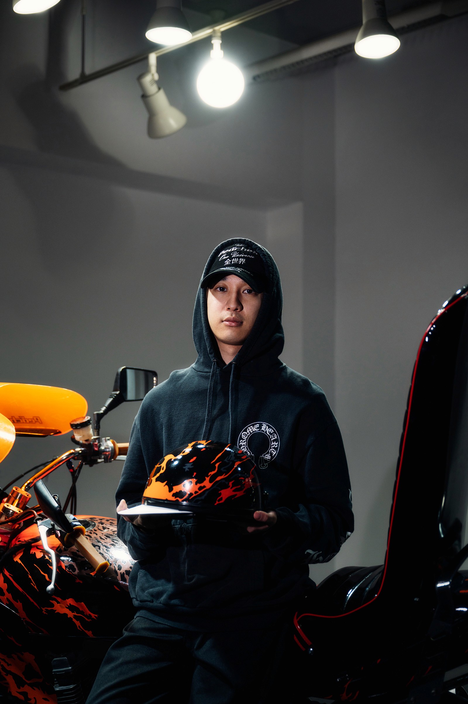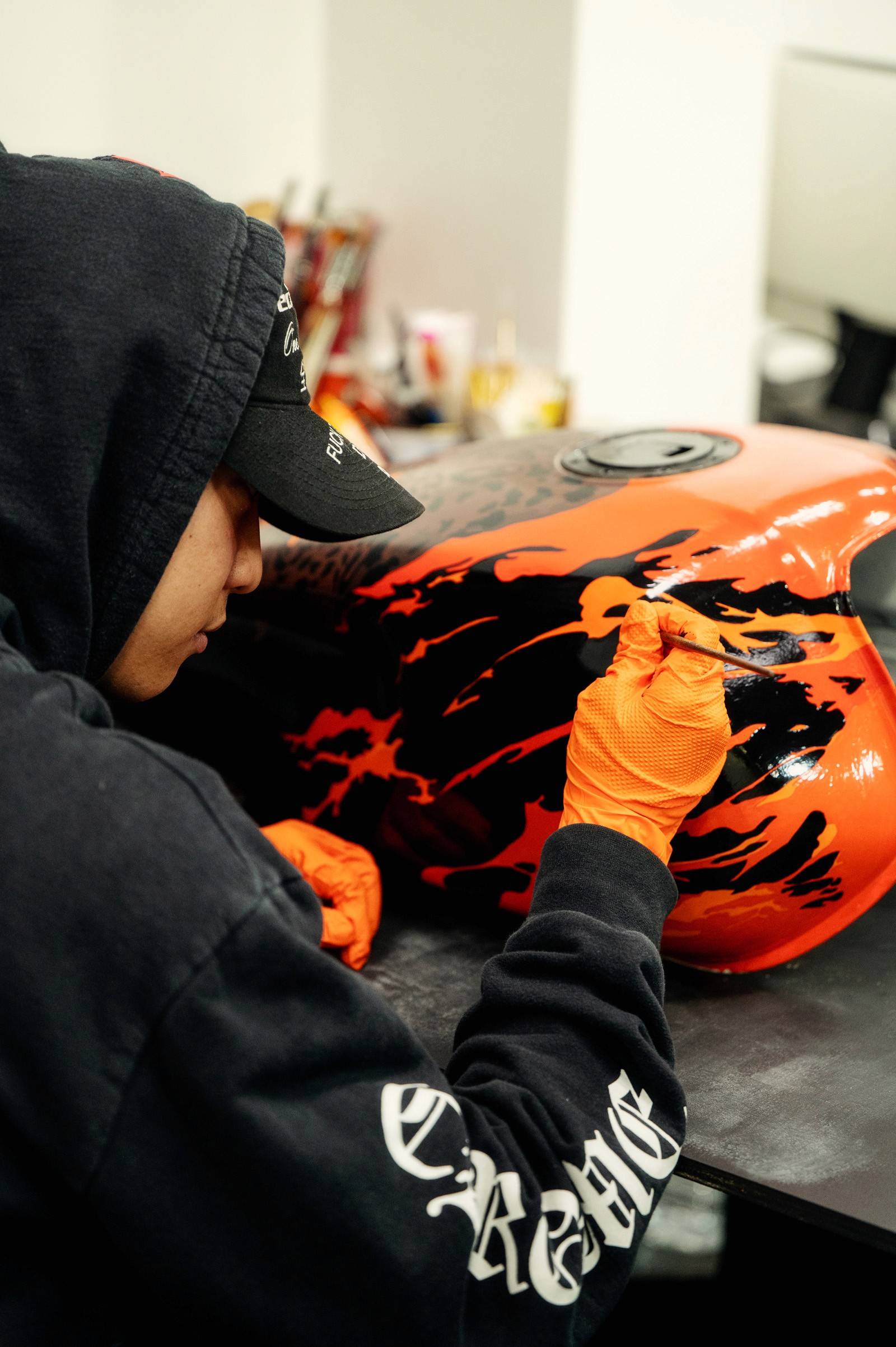 Peaches. Japan は、今回のプロジェクトでは Jinya Yamakawa 氏による現代アートと、荒々しくオイルにまみれたメカニカルな旧車會の世界との対比に焦点を当てました。Jinya Yamakawa 氏は、スピードと勝利が最重要とされるモータースポーツのバックグラウンドを持ちながら、繊細で丹念な手描きのアートをバイクの燃料タンクやカウル全体に施すことで、驚くべき対比を生み出しています。そのスタイルは旧車會バイクの攻めの姿勢を持つ性質に劣らず、大胆で独自性に富んでいます。