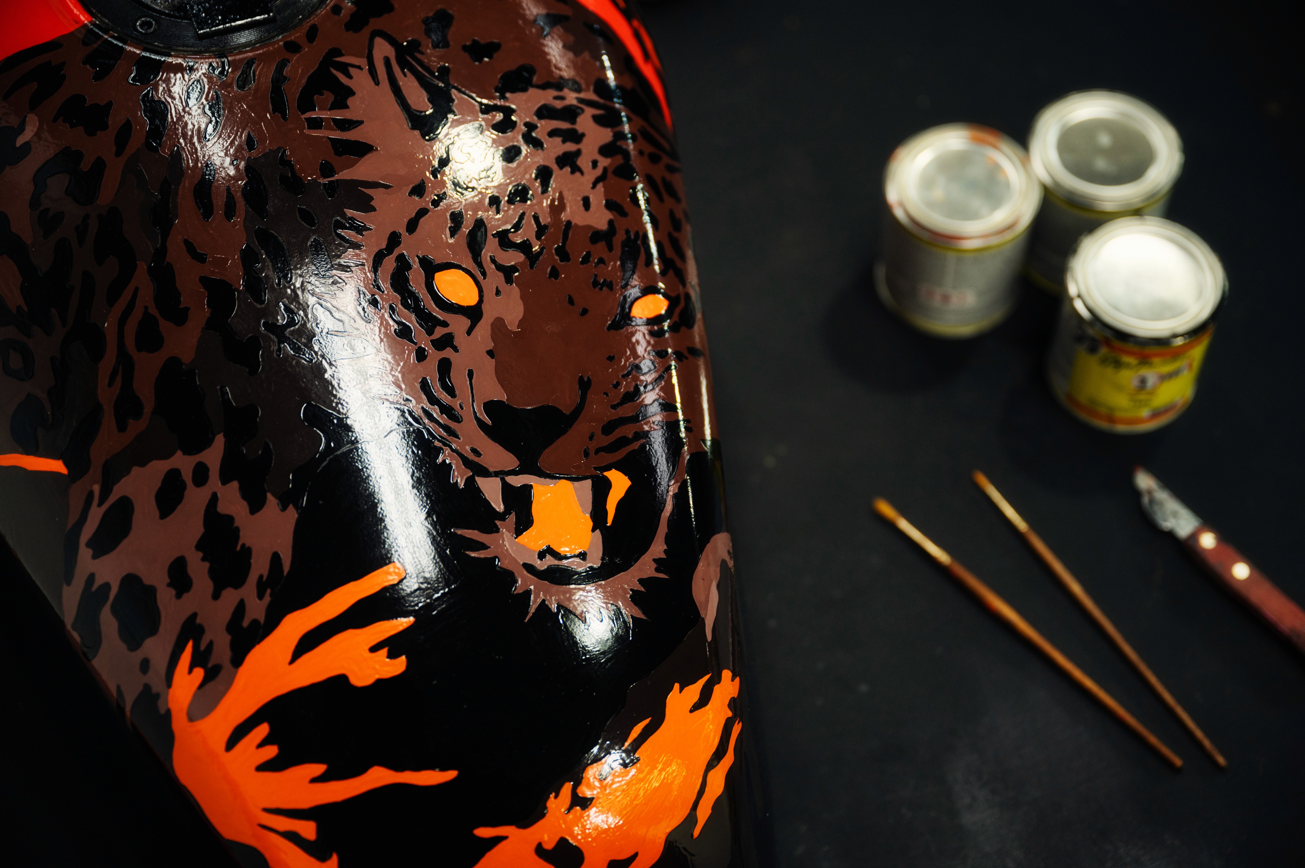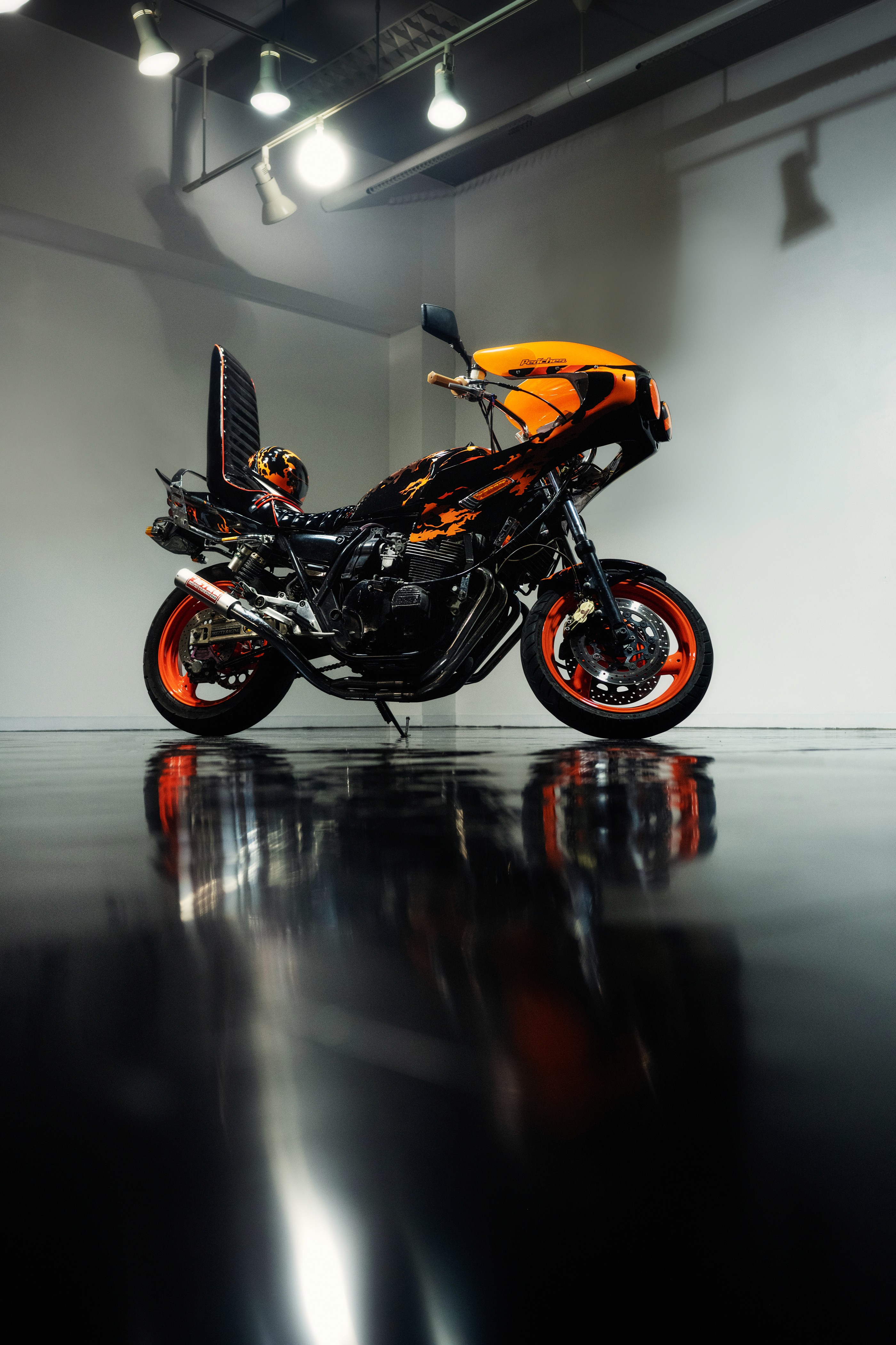 For this project, Peaches. Japan wanted to highlight the contrast between Jinya Yamanaka’s hand-painted modern art and the gritty, oil-stained mechanical world of Kyushakai. Jinya Yamanaka, who comes from a motorsports background where speed and victory over everything, brings a surprising contrast with his patiently stroked, hand-painted artwork, visible across the XJR400’s fuel tank and fairings. His style is as bold and distinctive as the aggressive nature of Kyushakai bikes.